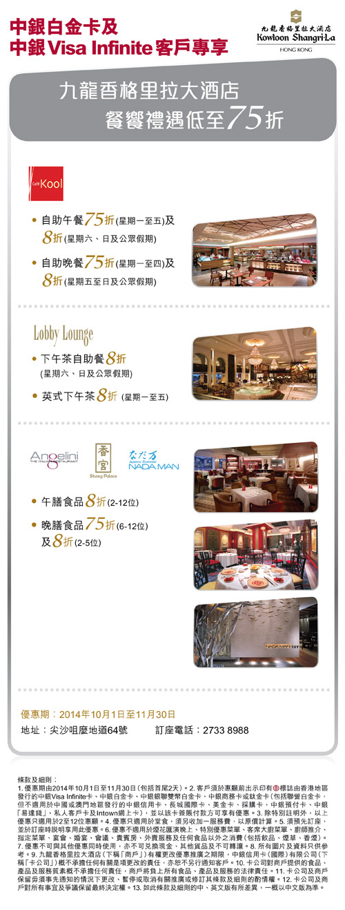 中銀白金卡及中銀Visa Infinite客戶專享九龍香格里拉大酒店