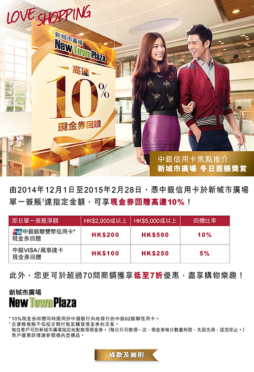 憑中銀信用卡於新城市廣場簽賬享現金券回贈高達10%!
