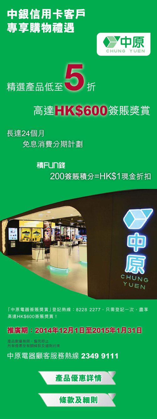 中銀信用卡客戶專享中原電器高達HK$600簽賬獎賞及