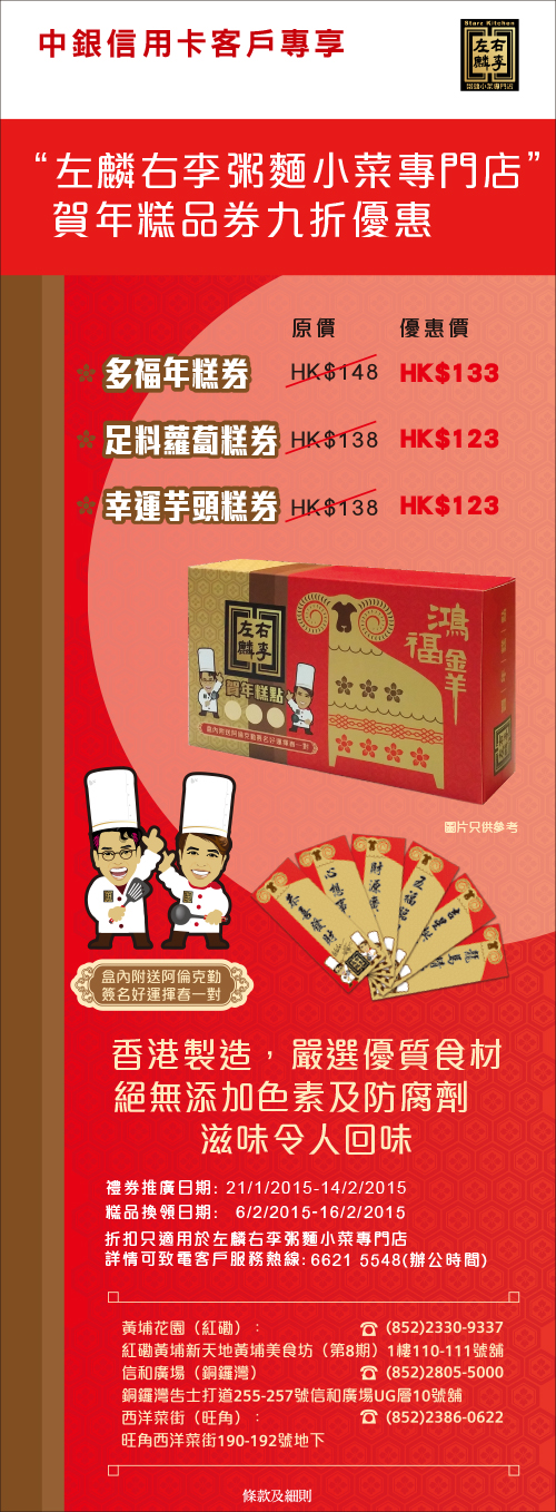 中銀信用卡客戶專享"左麟右李粥麵小菜專門店"賀年糕品券