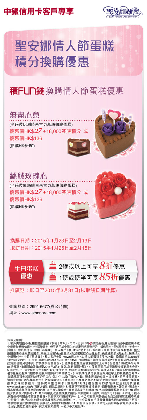 中银信用卡客户专享圣安娜情人节蛋糕积分换购优惠