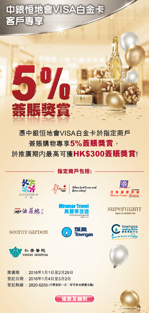 中银恒地会VISA白金卡客户专享5%签账奖赏