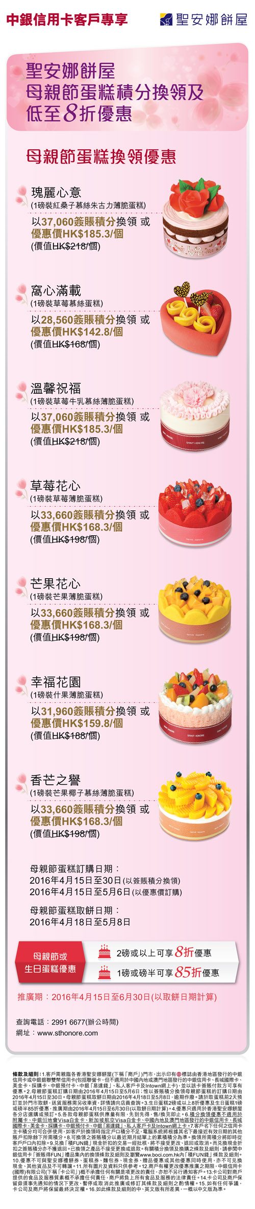 中银信用卡客户专享圣安娜母亲节蛋糕积分换购优惠及生日蛋糕