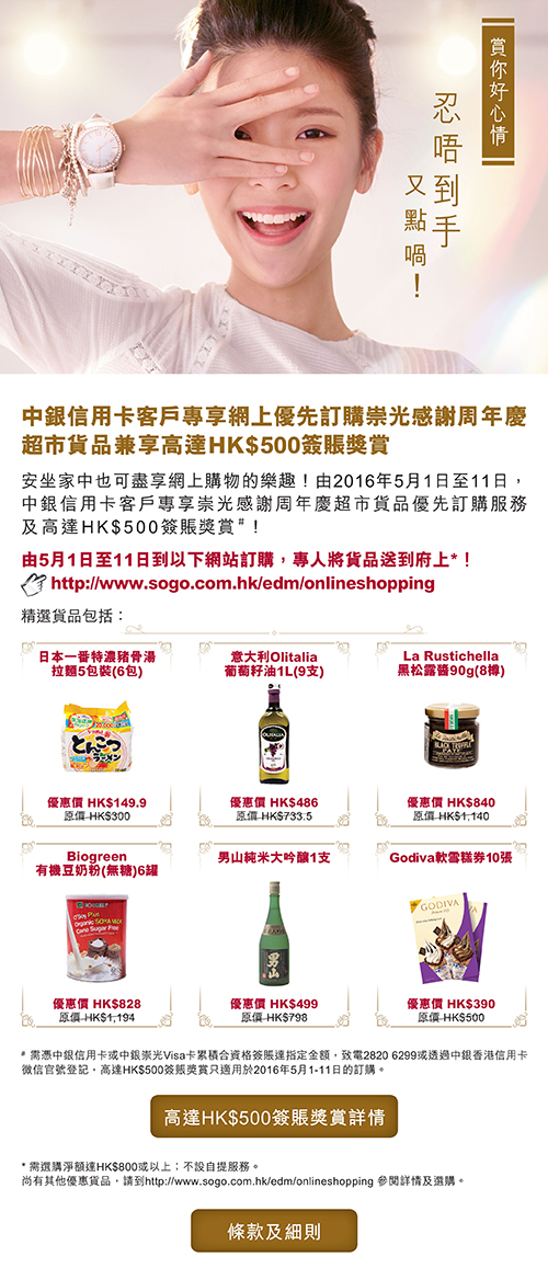 中銀信用卡客戶專享網上優先訂購崇光感謝周年慶超市貨品兼享