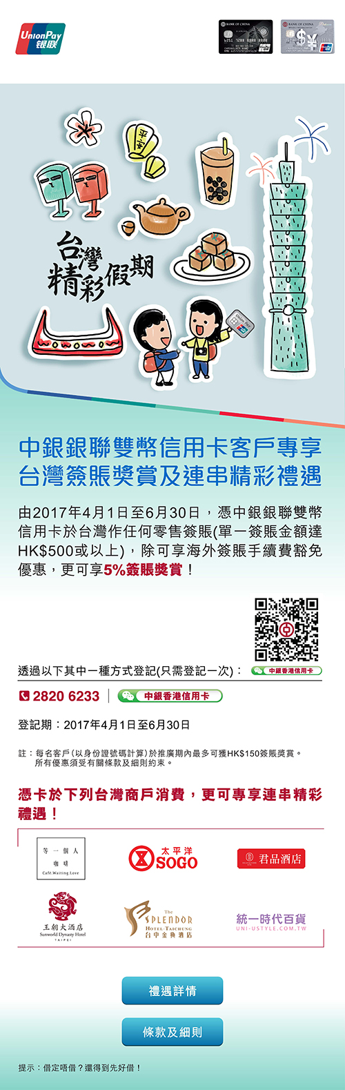 中銀銀聯雙幣信用卡客戶専享台灣5%簽賬獎賞及精彩禮遇