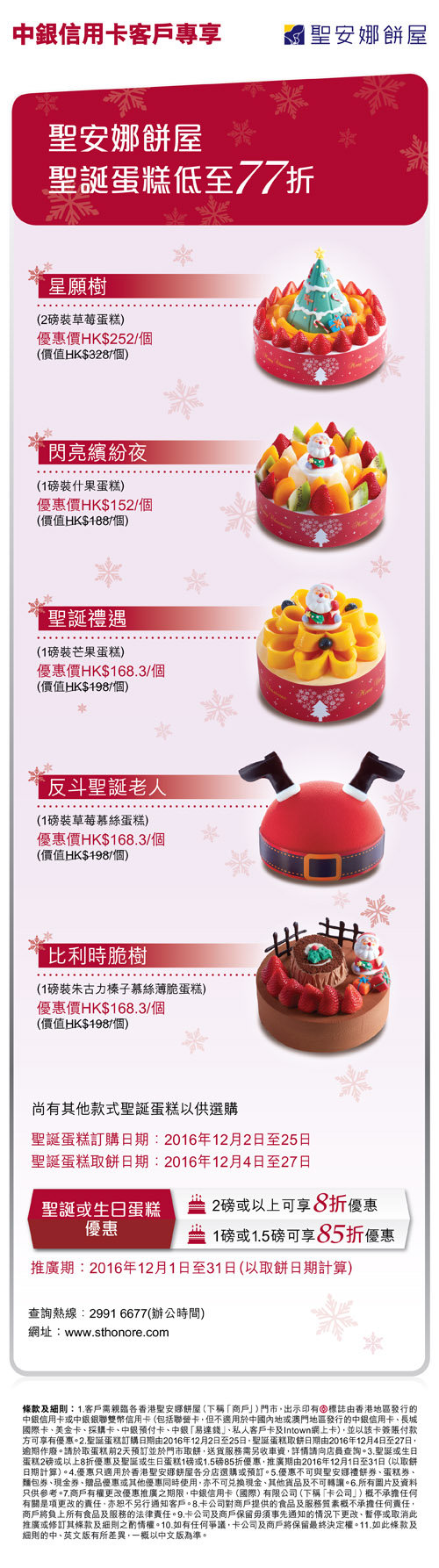 中銀信用卡客戶專享聖安娜餅屋聖誕蛋糕低至77折