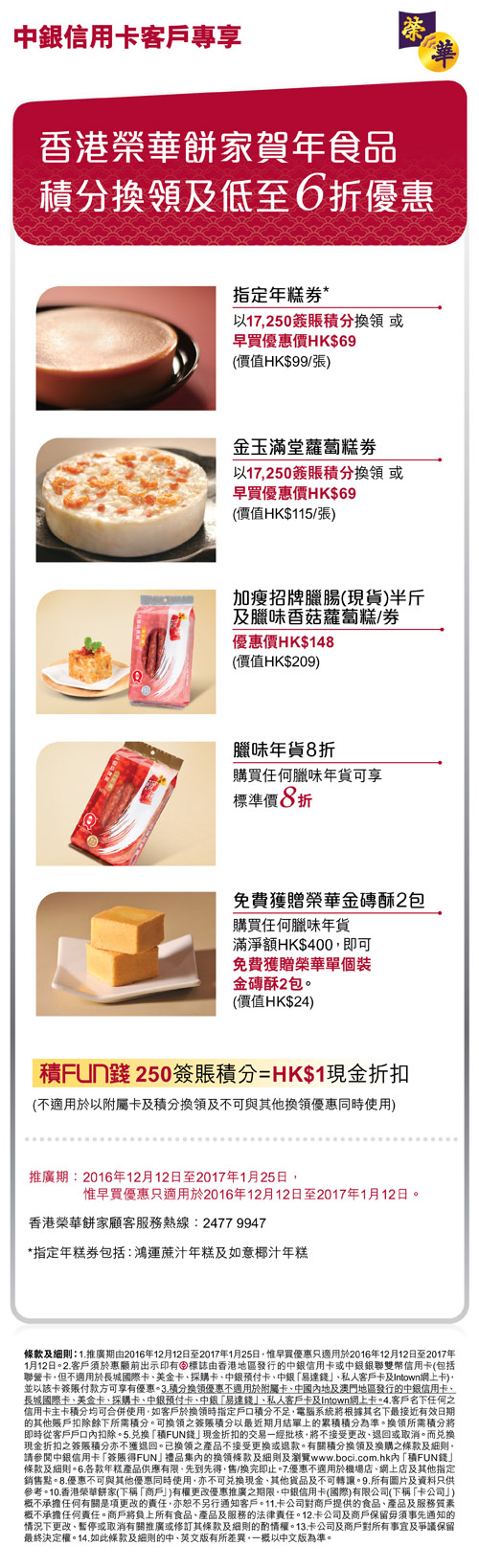 中銀信用卡客戶專享香港榮華餅家賀年食品積分換購及低至6折優惠