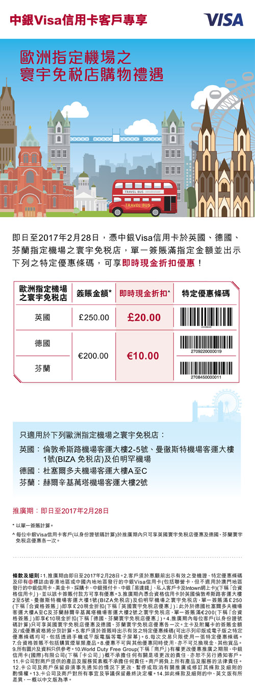中银Visa信用卡客户专享欧洲指定机场之寰宇免税店购物礼遇