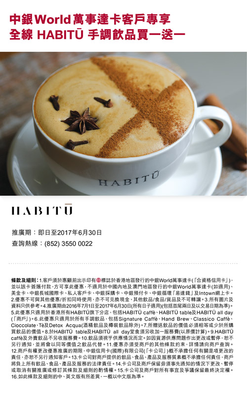 中銀World萬事達卡客戶專享全線HABITŪ手調飲品買一送一