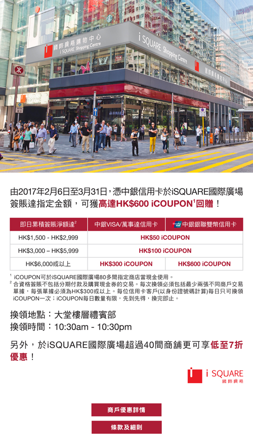 中銀信用卡客戶專享iSQUARE國際廣場高達HK$600 iCOUPON回贈