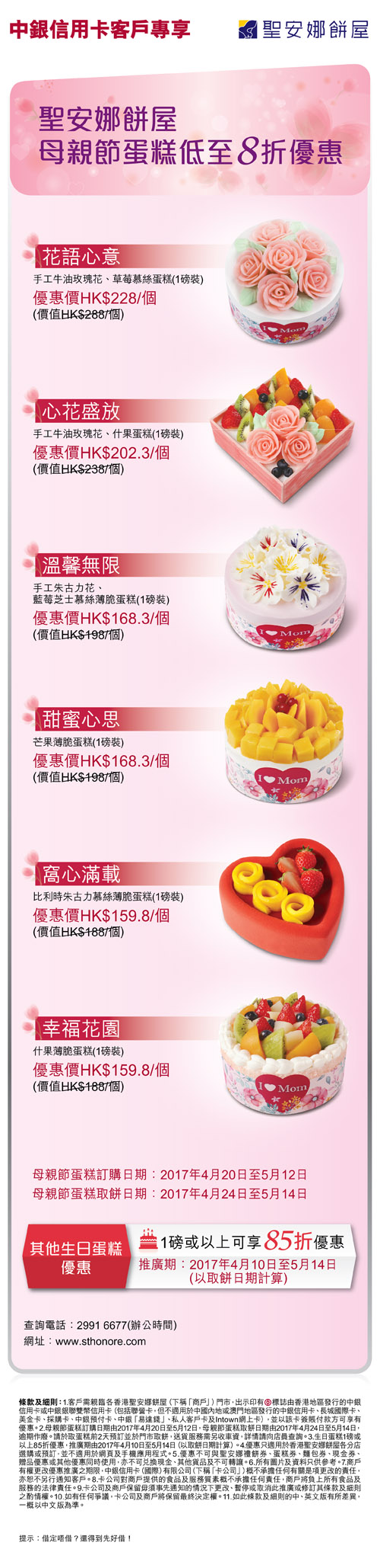 中银信用卡客户专享圣安娜饼屋母亲节蛋糕低至8折优惠