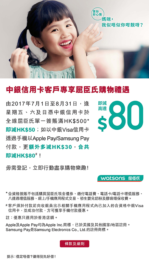 憑中銀信用卡於全線屈臣氏簽賬滿HK$500即減高達HK$80!