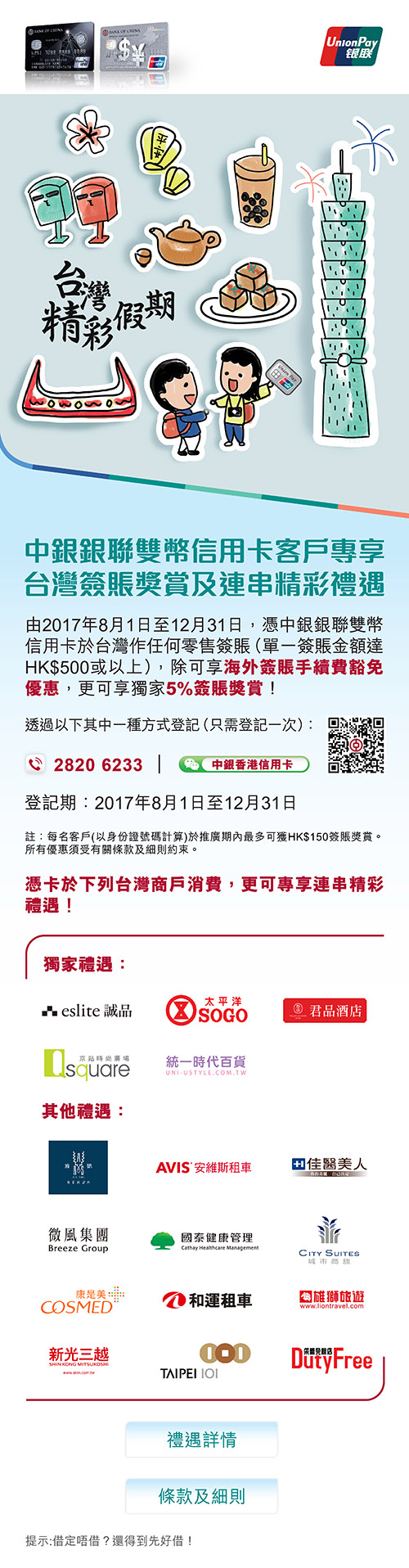 中銀銀聯雙幣信用卡客戶專享台灣5%簽賬獎賞及精彩禮遇