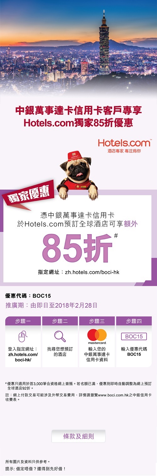 中銀萬事達卡信用卡客戶專享Hotels.com獨家85折優惠