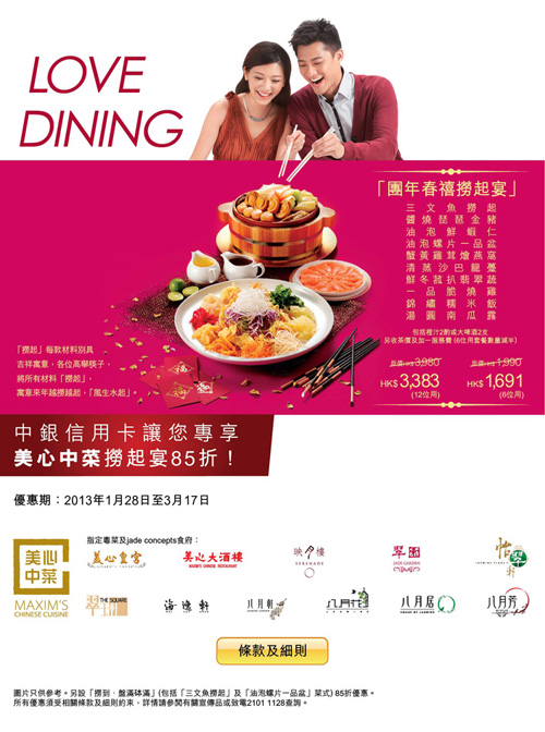中銀信用卡卡戶專享美心中菜「團年春禧撈起宴」85折優惠