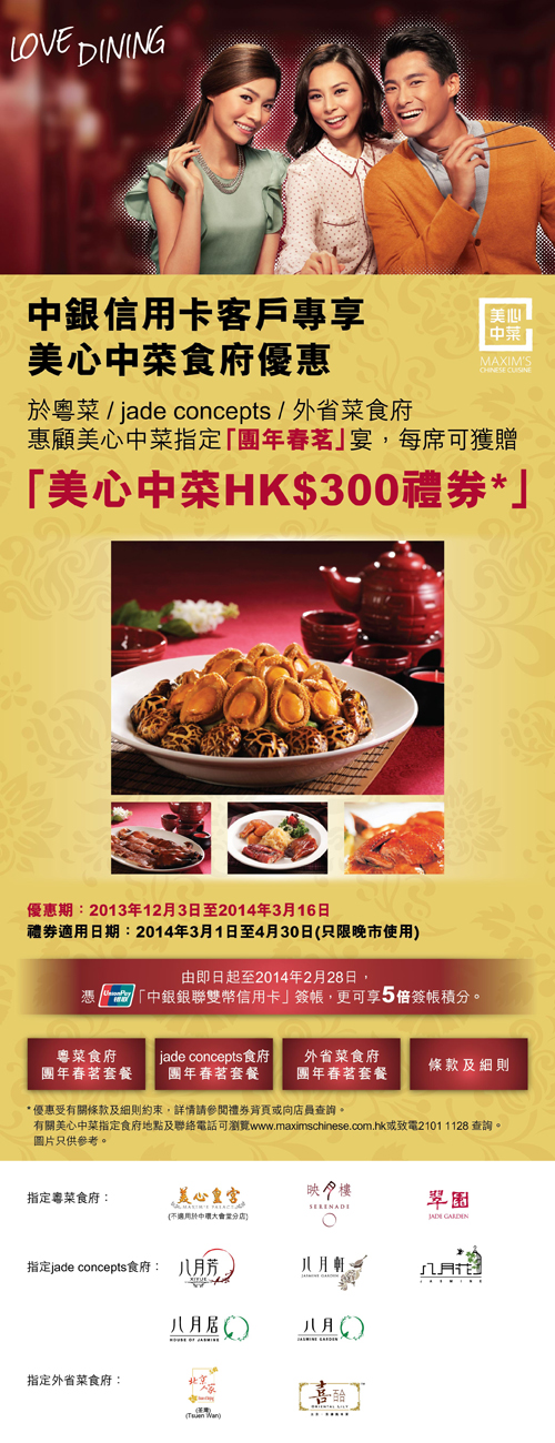 憑中銀信用卡於指定美心中菜食府惠顧「團年春茗」宴