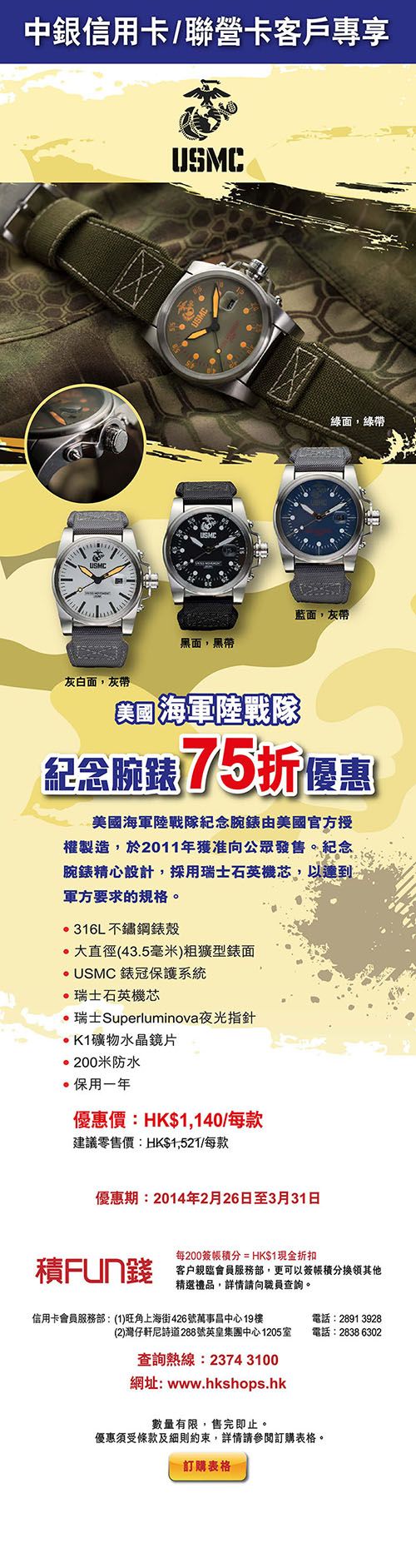 中銀信用卡/聯營卡客戶專享美國海軍陸戰隊紀念腕表75折