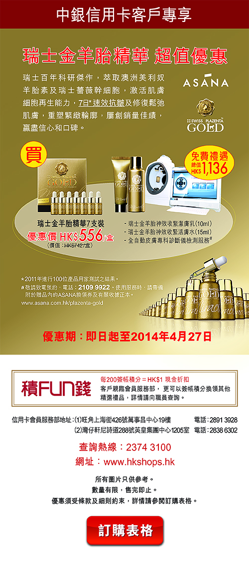 中銀信用卡/聯營卡客戶專享ASANA瑞士金羊胎精華超值優惠