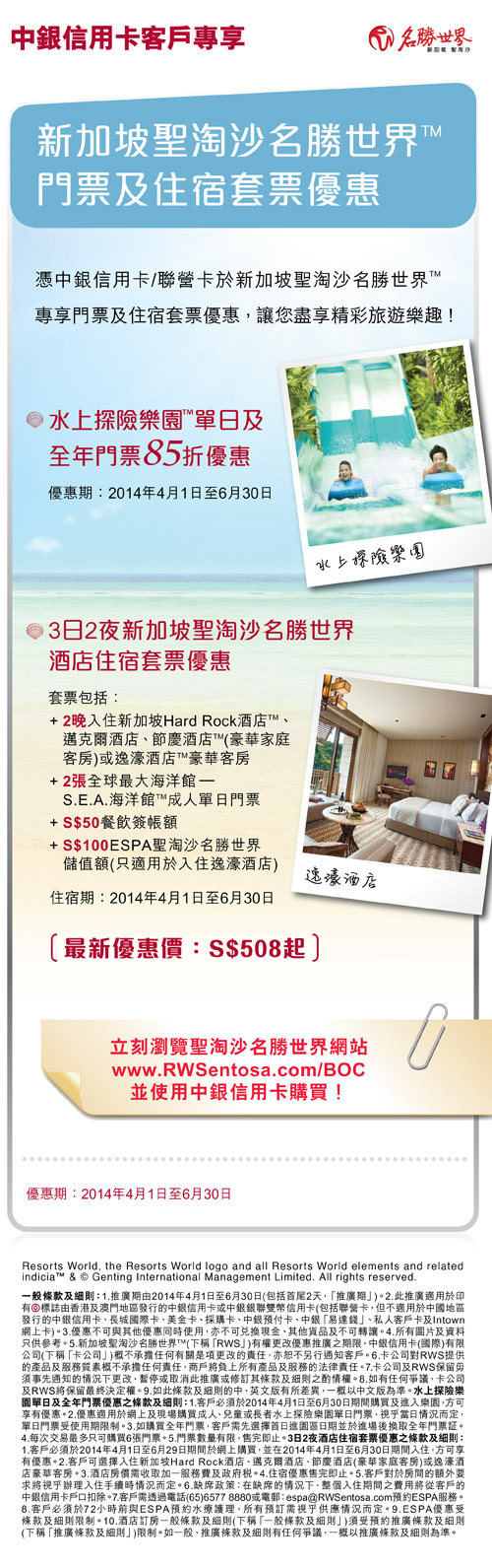 中銀信用卡/聯營卡客戶專享新加坡聖淘沙名勝世界™門票及