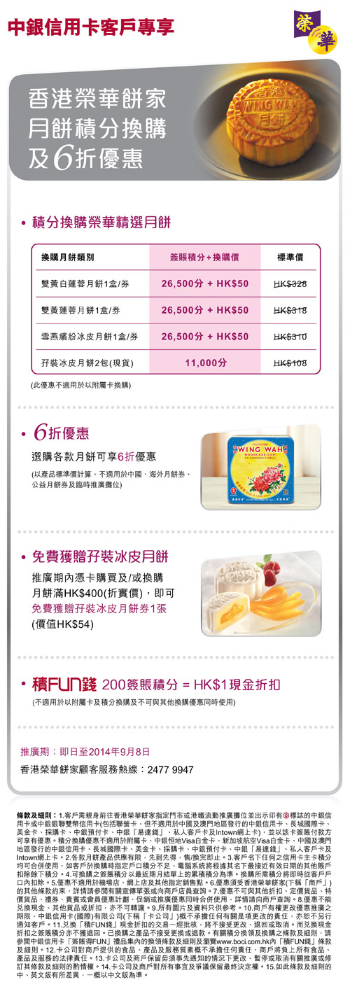 中銀信用卡客戶專享香港榮華餅家月餅積分換購及6折優惠