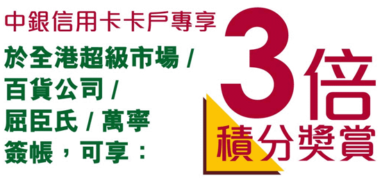 卡戶於全港超級市場 / 百貨公司 / 屈臣氏 / 萬寧簽帳,即享: 3倍簽帳積分獎賞