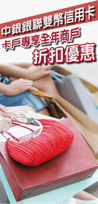 - 是次推廣適用於中銀銀聯雙幣信用卡(香港及澳門所發行之人民幣信用卡或借記卡除外)。