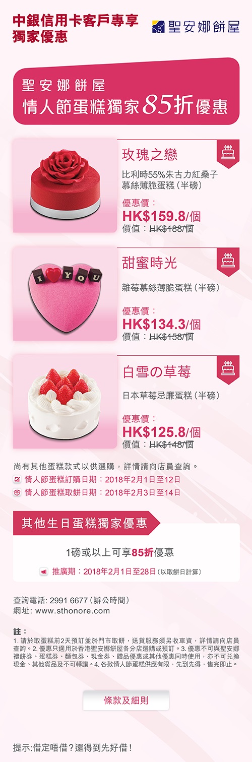中银信用卡客户专享圣安娜饼屋情人节蛋糕独家85折优惠