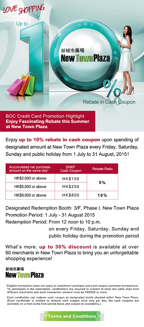 Enjoy up to 10% rebate in cash coupon at New Town Plaza
