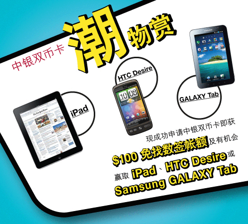 由即日起至2011年4月30日,凡于网上成功申请中银银联双币信用卡即享: